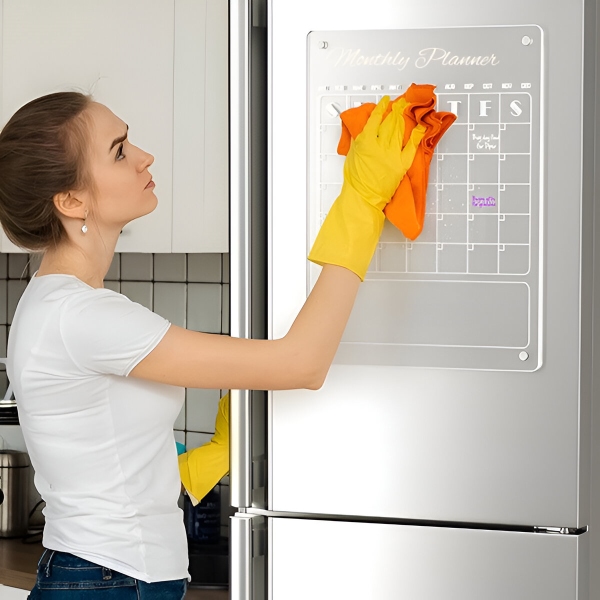 Хартиените планери се изчерпват след месец и отиват направо в кофата. Прозрачната акрилна повърхност се избърсва напълно чисто за секунди с включената кърпа – без следи, без петна, без остатъци. Повърхността е устойчива на надраскване и петна, така че остава кристално чиста след стотици избърсвания.
