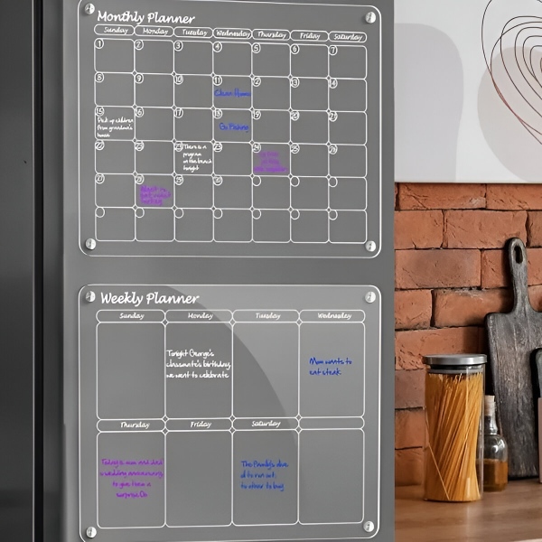Комплект акрилни календари за хладилник – Месечен + седмичен планер (всеки 40 x 30 см), 4 магнита, сухо изтриване, включени маркери | REUSABLEPLAN
