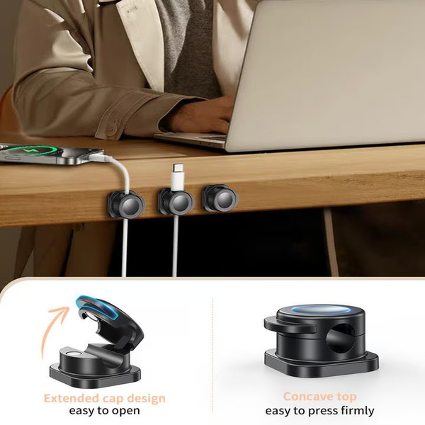 Поддържа зарядните ви кабели подредени и предотвратява падането им от бюрото.
